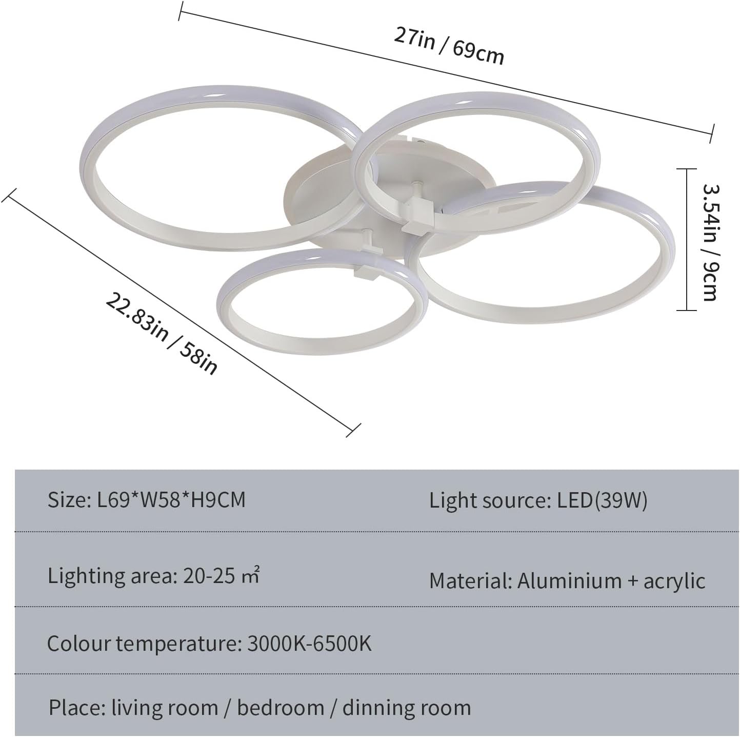 Incorpora chips LED integrados que proporcionan una iluminación estable, sin parpadeos y de bajo consumo. Dimensiones totales: 69 × 58 × 9 cm. Peso: 2,2 kg. Potencia: 39 W. Voltaje: 220–240 V.