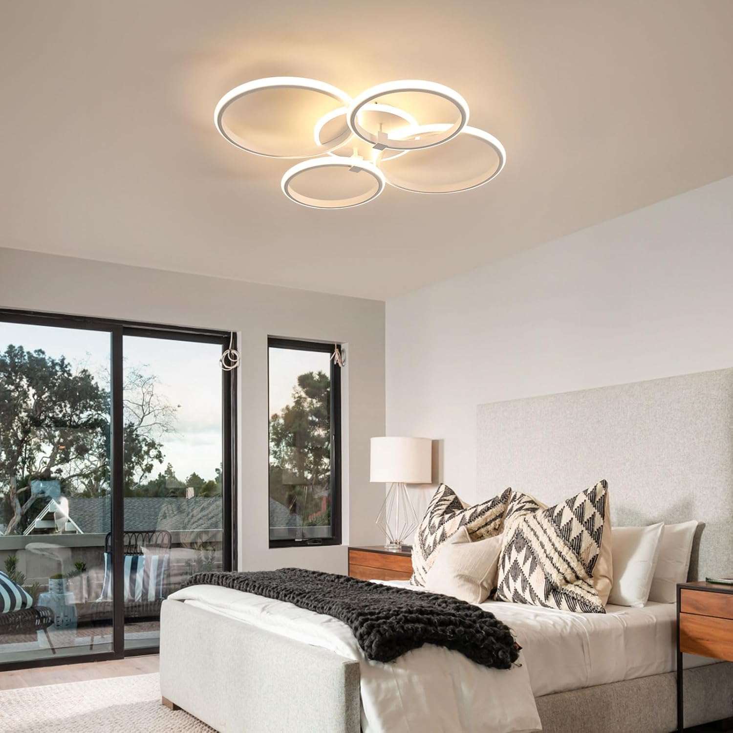 Cuenta con cuatro aros circulares con iluminación exterior que garantizan una distribución uniforme de la luz. Adecuado para dormitorios, salones, cocinas, comedores, hoteles y oficinas.
